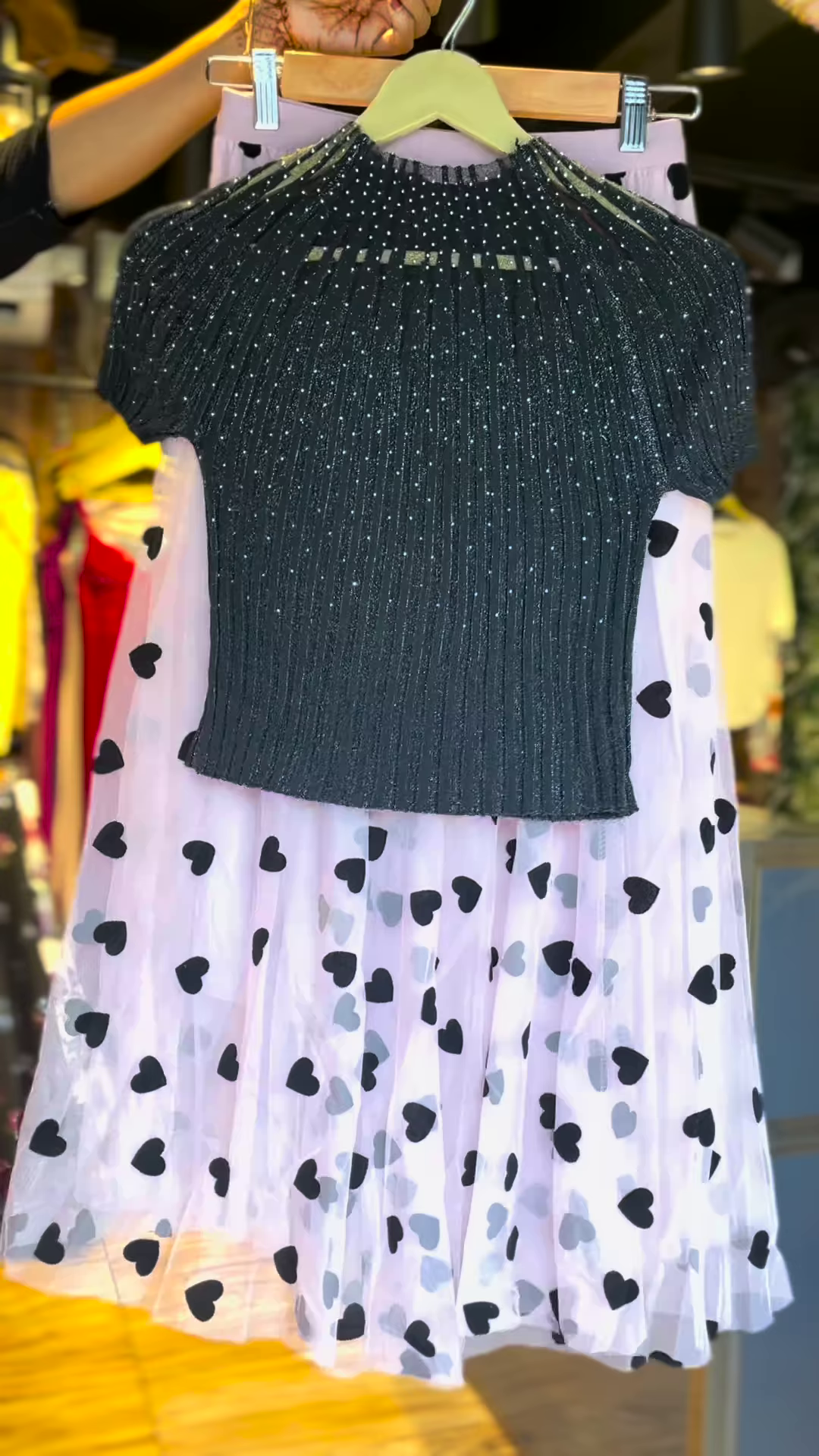 Sparkle karo jaise koi fashion fairy ho, is glamorous black glitter top aur cute heart print skirt ke combo mein. Ye set hai un ladkiyon ke liye jo chhoti party se lekar badi reel tak, har moment mein chamakna chahti hain! 🌟💕