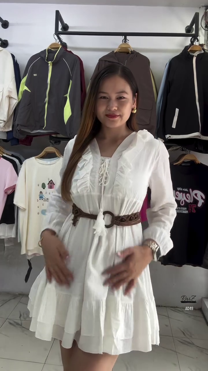 The A-line skirt flatters all body types, while tiered ruffle layers at the hem give the dress a youthful, flirty finish. Its mini length adds a touch of modern chic, making it ideal for daytime outings, weekend brunches, or even evening gatherings. Styled with sneakers, as shown in the photo, it delivers a casual and trendy vibe. For a more polished outfit, pair it with strappy sandals or heeled boots to transform it into a chic evening ensemble.