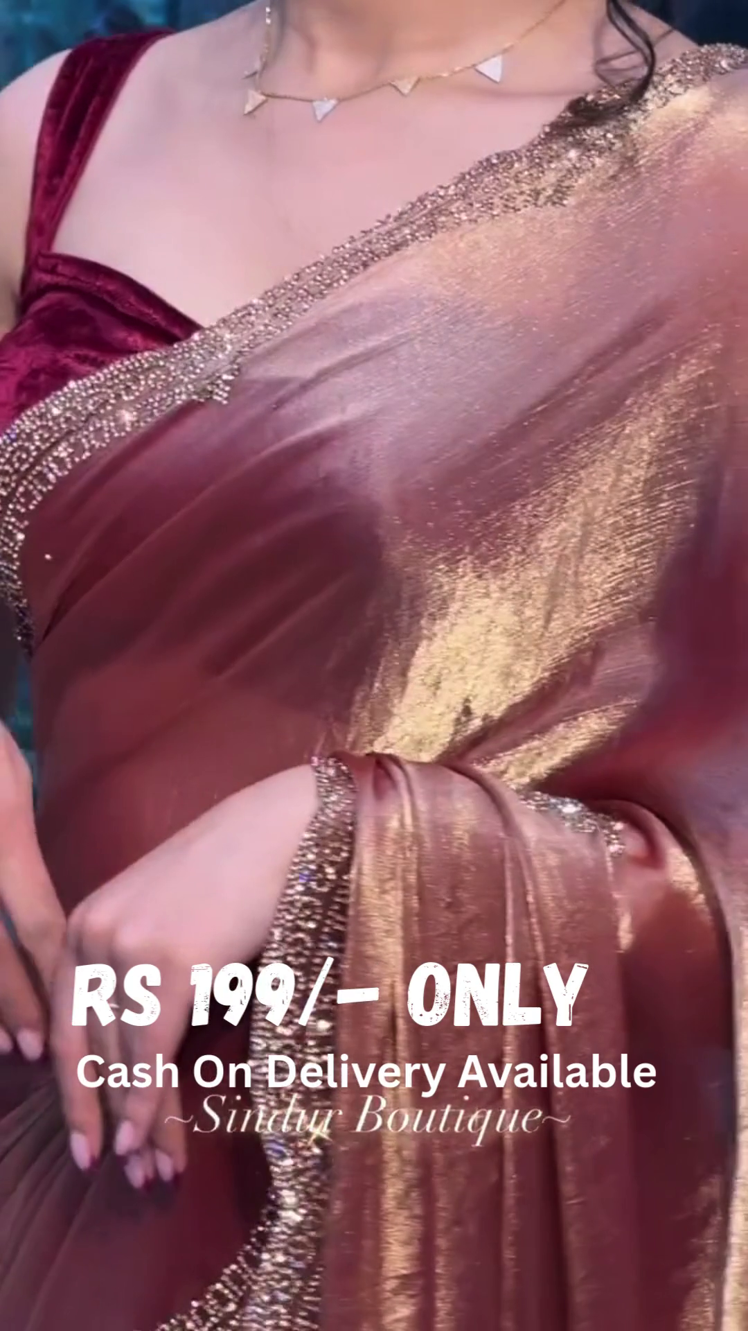 Design & Craftsmanship: Drape yourself in pure elegance with this rose gold velvet saree, featuring an ultra-luxurious texture and a soft sheen that enhances its regal appeal. The shimmering sequin and beadwork along the intricately designed border add a mesmerizing touch of glamour.