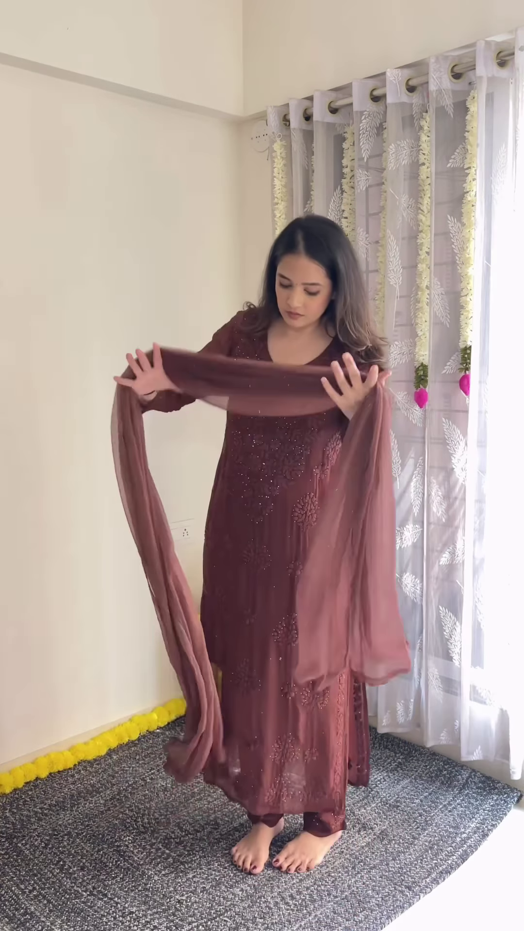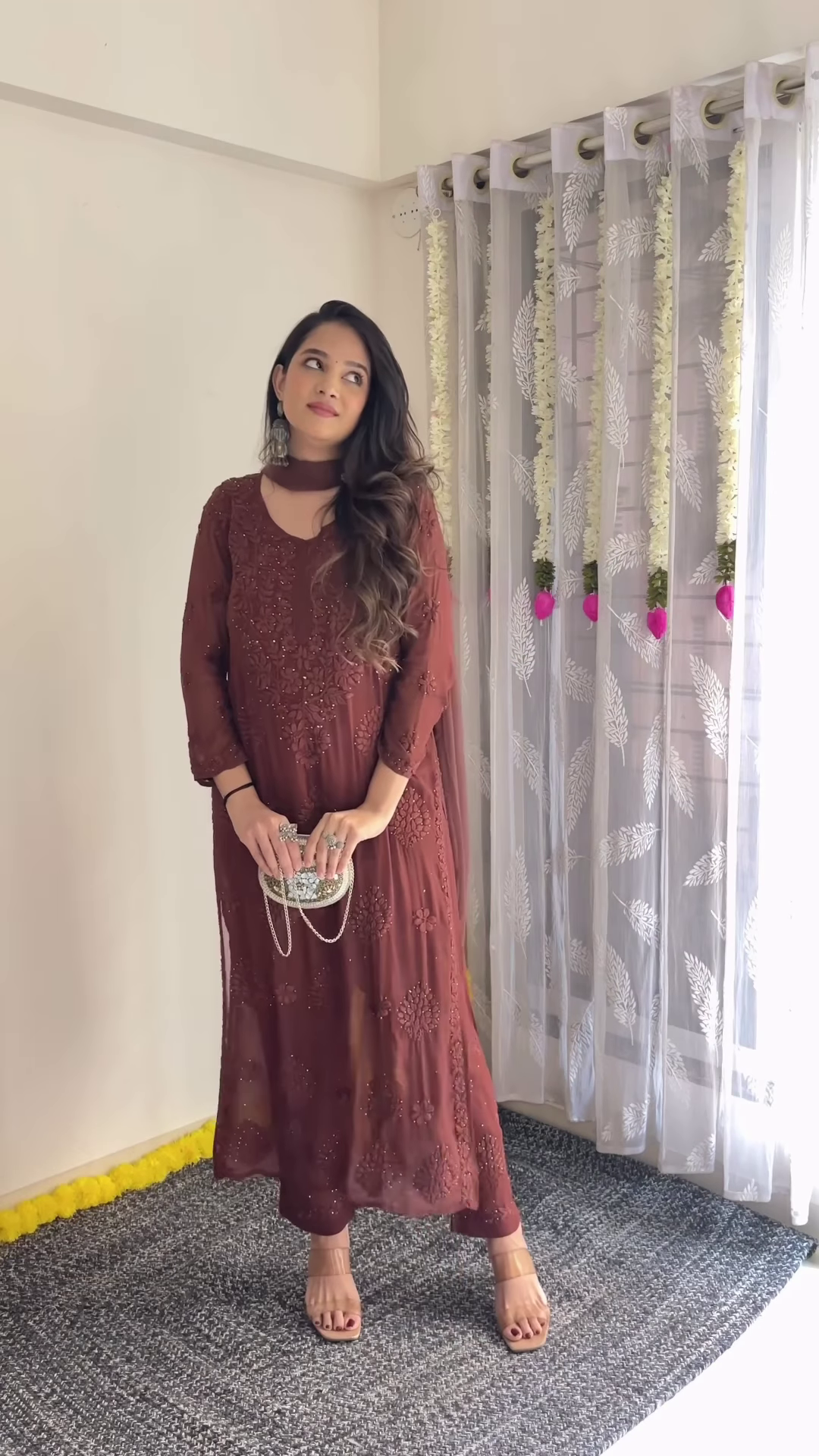 • Footwear: Nude, golden, or maroon heels/sandals work beautifully with the tone of the outfit.