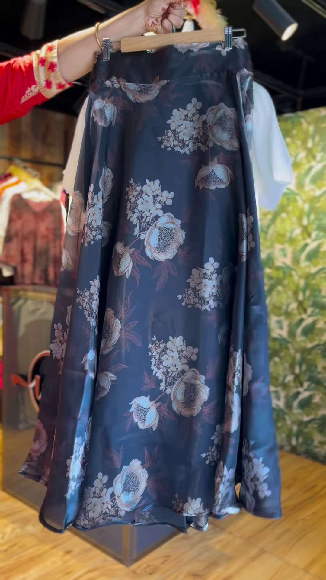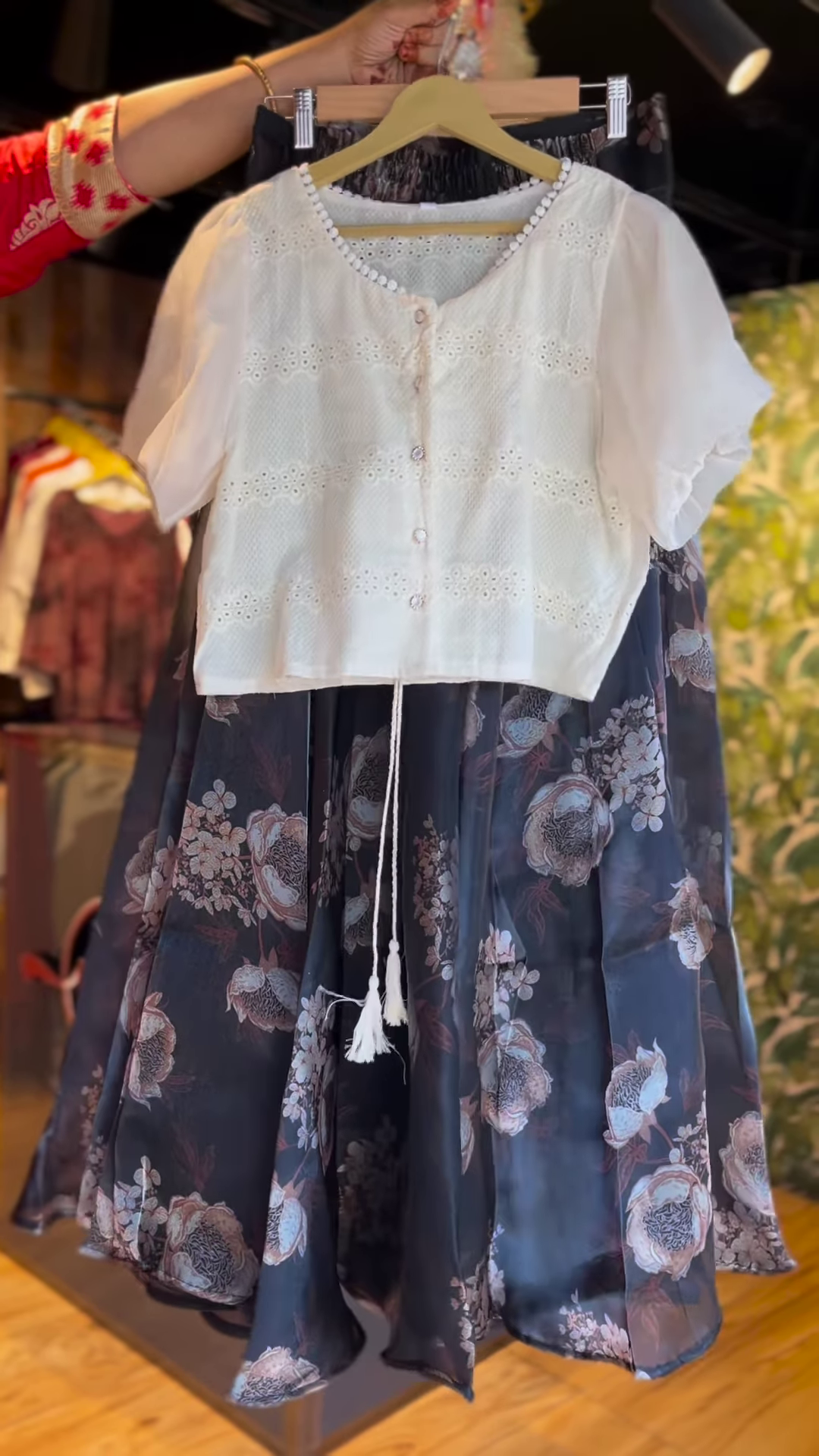 Step into soft elegance with the Moonlit Garden set — a graceful pairing of textures and tones. The off-white crop blouse, adorned with dainty eyelet lace and pearl button details, exudes old-world charm. It beautifully contrasts the deep midnight-blue skirt, blooming with muted florals that sway like shadows in moonlight. Perfect for garden brunches or festive evenings, this set is timeless poetry in motion.