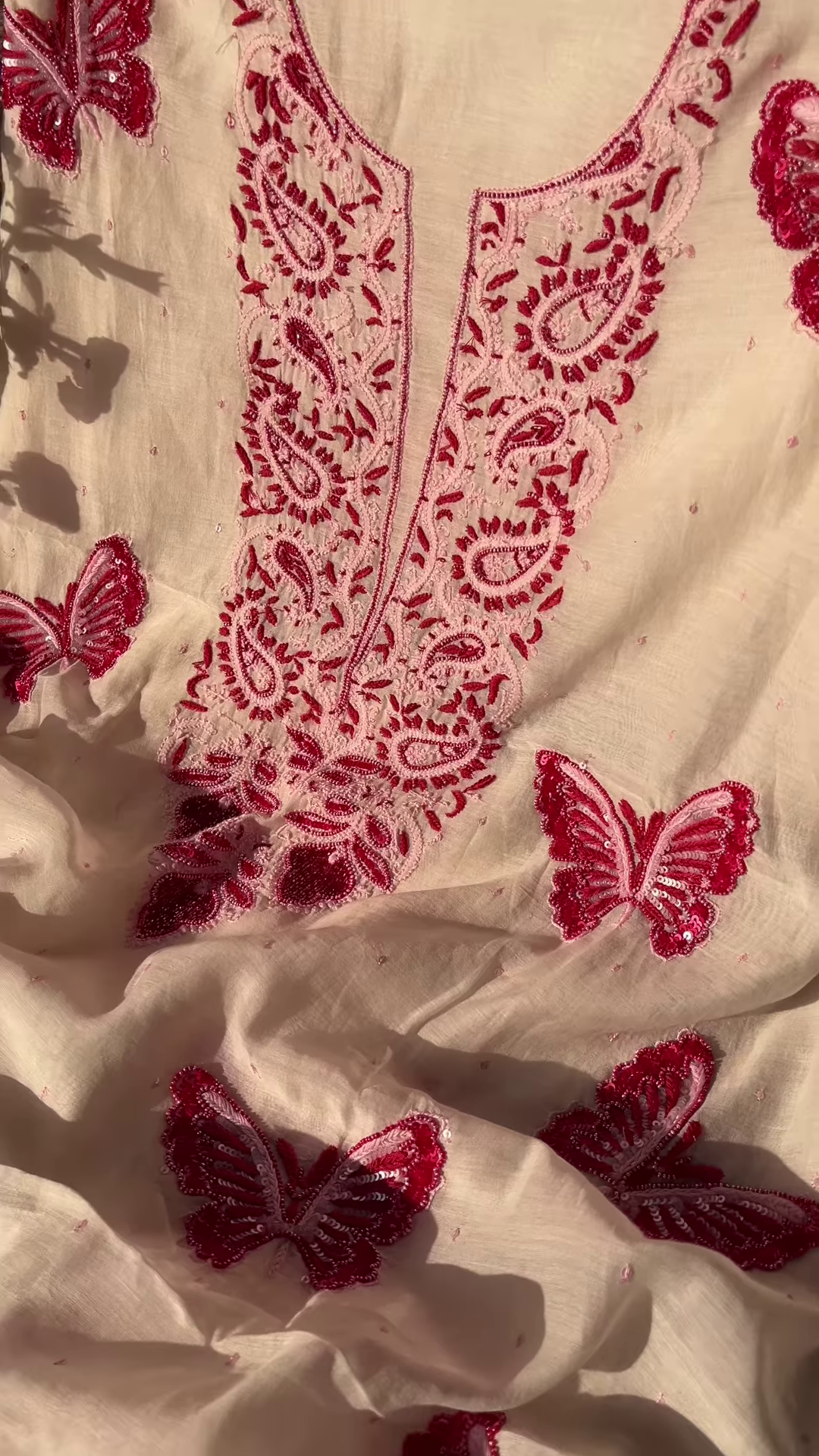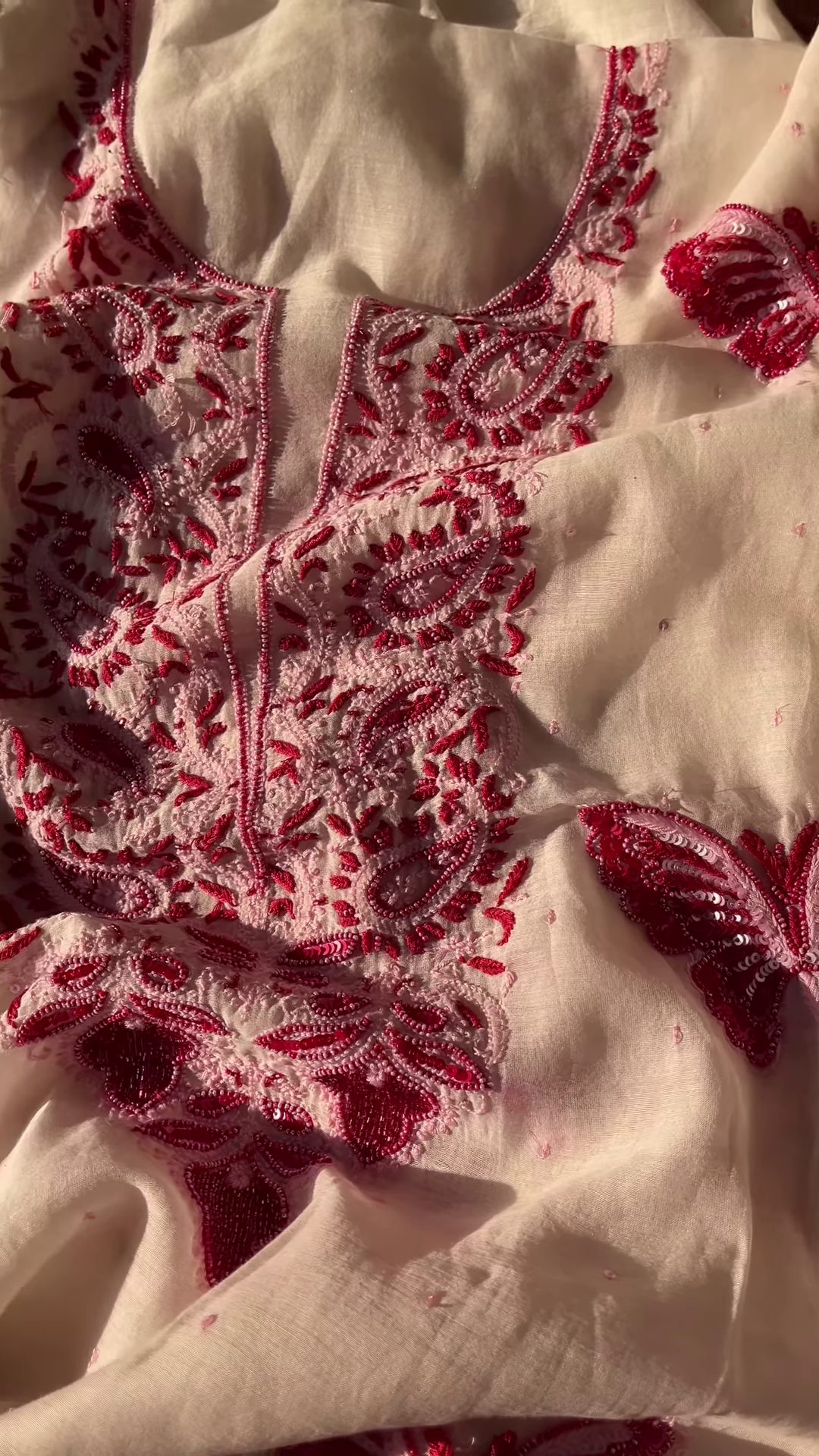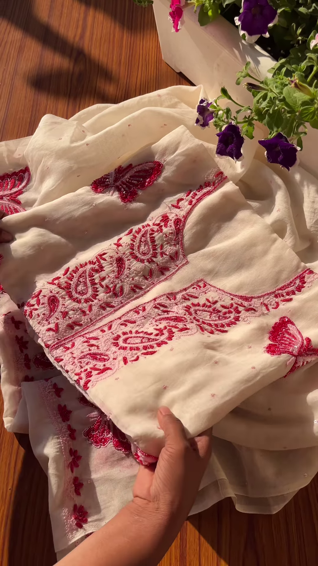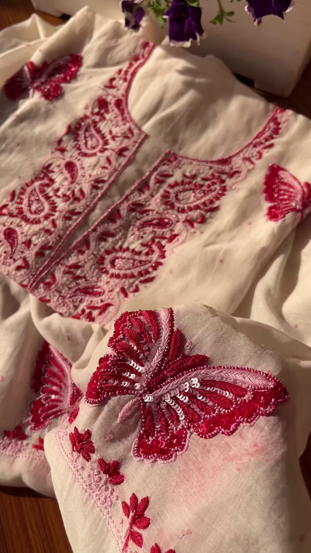 This exquisite unstitched suit set showcases the rich and intricate embroidery tradition of Kashmir on a soft off-white fabric. The fabric appears to be a lightweight and flowing material, possibly cotton, georgette, or a similar fine textile, suggesting a comfortable and graceful garment. The vibrant embroidery, predominantly in shades of deep pink or fuchsia, features characteristic Kashmiri motifs, creating a striking and culturally rich textile.