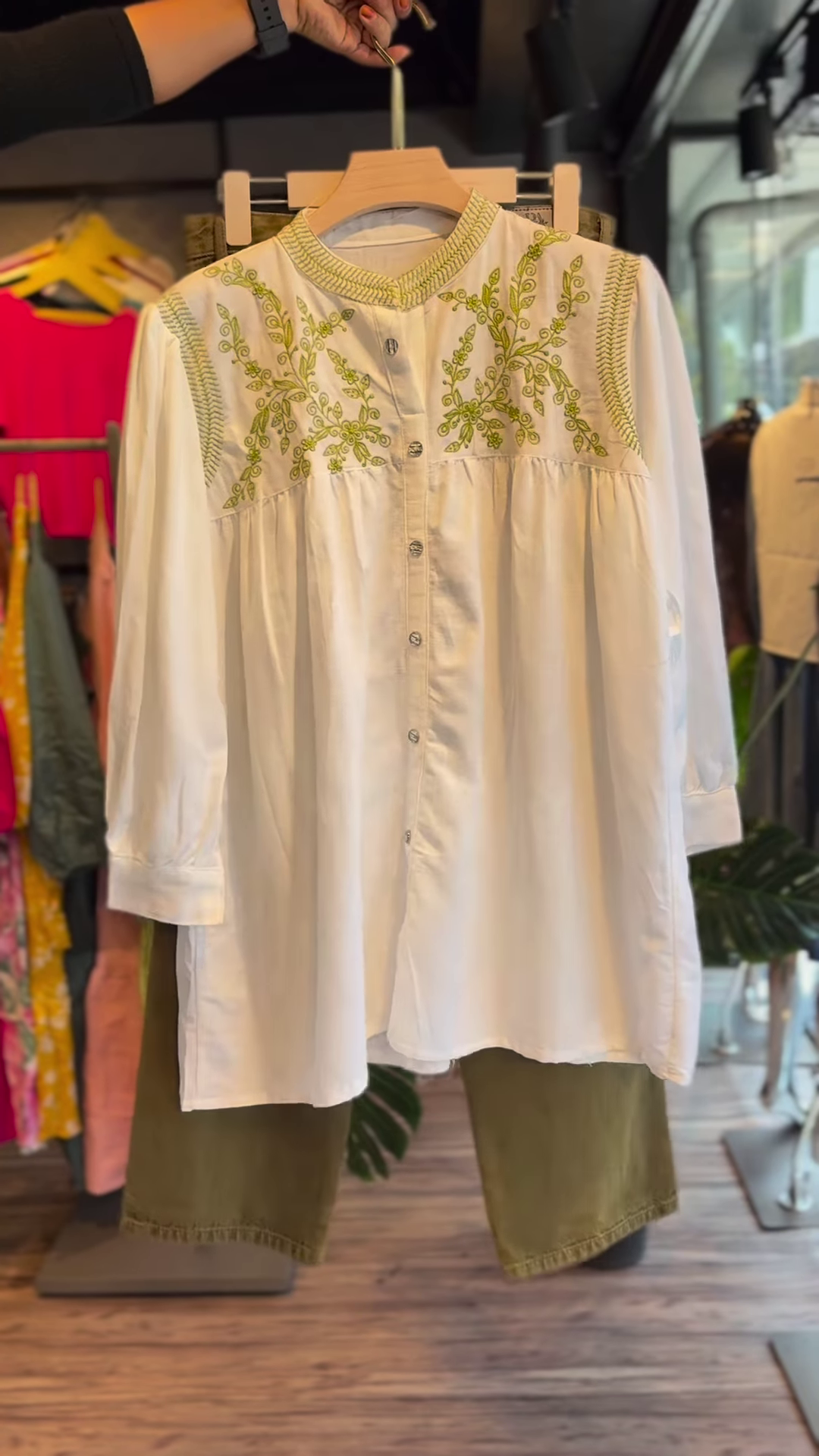 Crisp white cotton with pintucks and floral vine embroidery in olive green