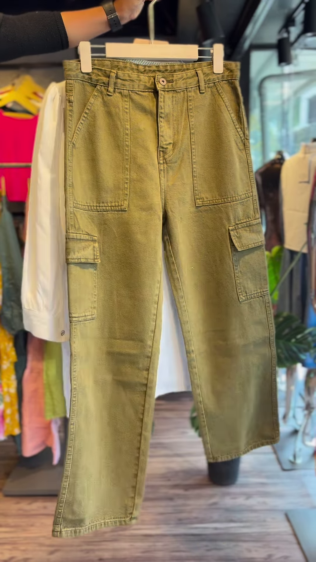 Olive green cropped pants with a straight cut
