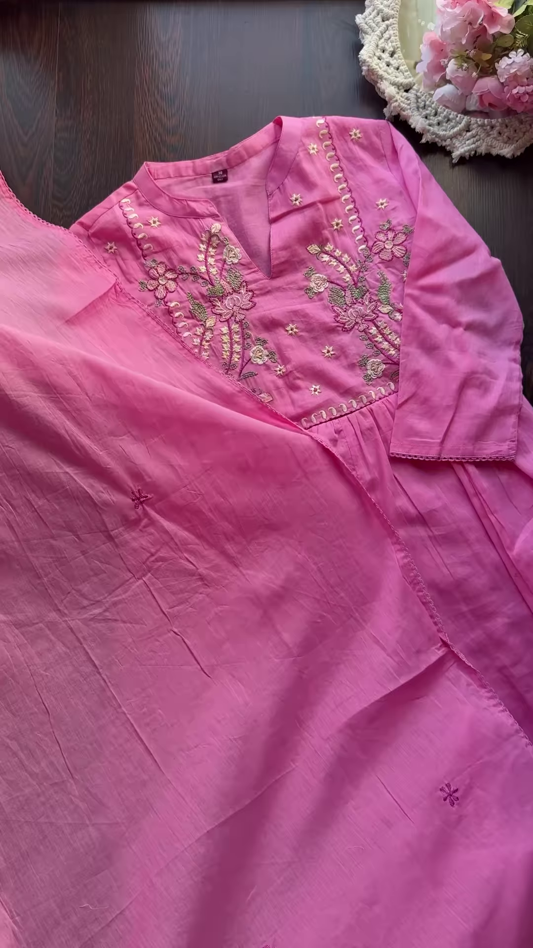 The soft pink kurta features embroidery in contrasting or complementary pastel shades, such as lighter pinks, whites, and subtle greens. The floral motifs might include stylized blossoms, delicate leaves, and winding vines, creating a feminine and charming look. The embroidery is likely concentrated around the neckline and yoke, adding a focal point of intricate detail.