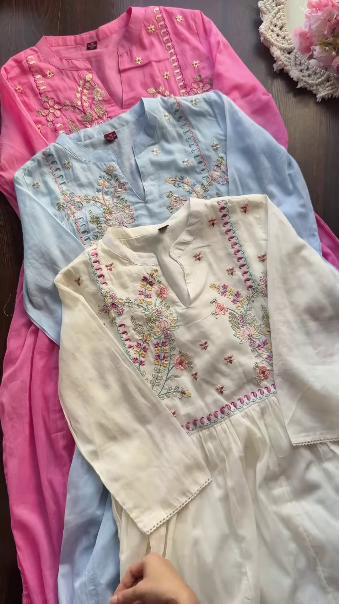 The classic off-white kurta provides a neutral and versatile base for a more vibrant or contrasting floral embroidery. The embroidery on this kurta could feature pastel shades similar to the other two, or it might incorporate slightly bolder hues to stand out against the light background. The floral designs on the off-white kurta might also have a unique style or arrangement, ensuring each kurta in the trio has its own distinct charm.