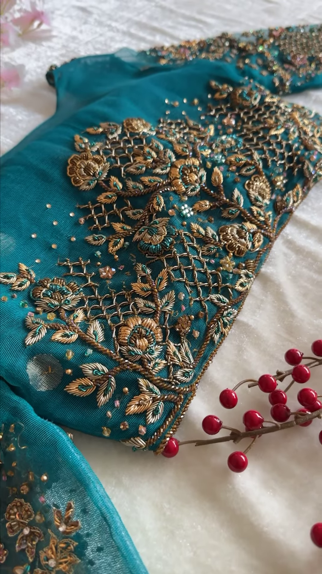 ✔ Hand-embroidered gold zardozi work for a luxurious look
